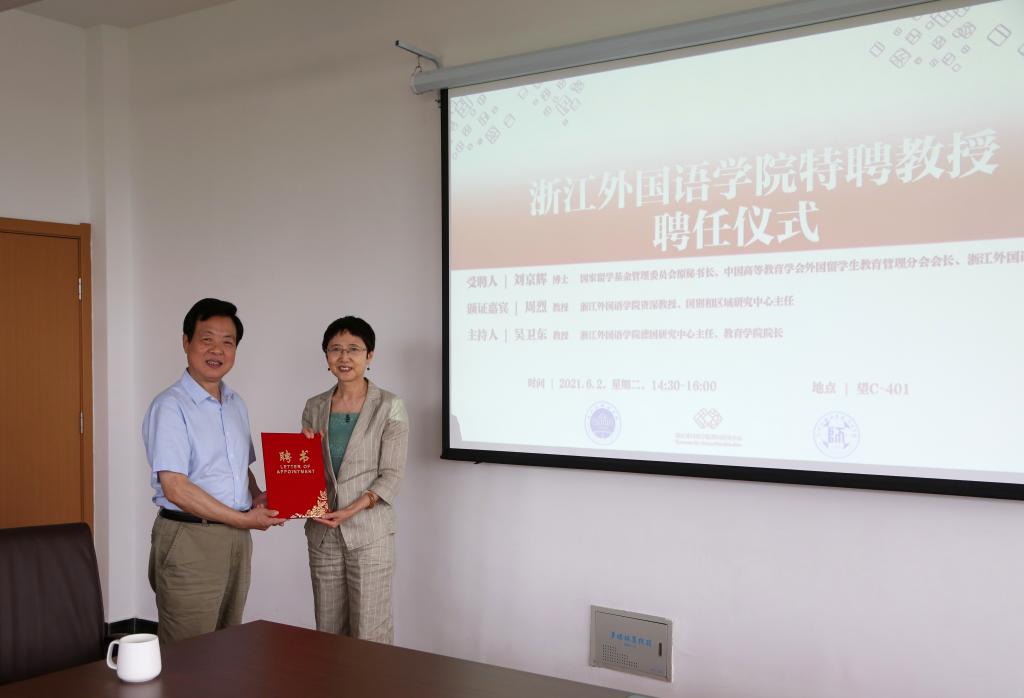 6月2日,国家留学基金管理委员会原秘书长、中国高等教育学会外国留学生管理分会理事长刘京辉女士续聘为我校特聘教授。校资深教授、国别和区域研究中心主任周烈教授为刘京辉女士颁发聘书。校德国研究中心主任、澳门六合彩高手