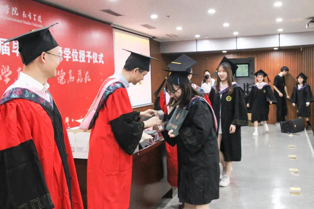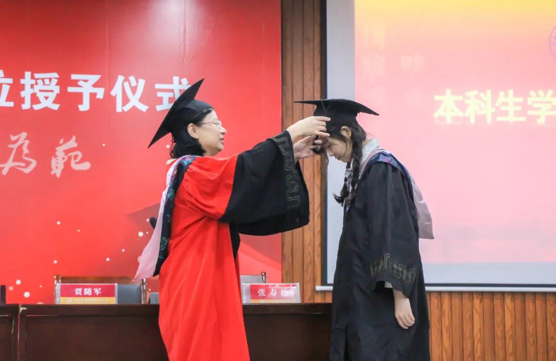 毕业生参加本科生学位授予仪式。院党总支书记高亚兵教授拨穗,院长吴卫东教授颁发学位证书,副院长何伟强、贾随军赠送毕业纪念品,副书记周礼赠送毕业照片,班主任行握手礼。