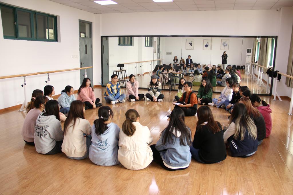 孙亚敏老师则把《学前儿童游戏与戏剧》课搬到了舞蹈教室里。19学前1班的同学们围坐一圈,在游戏中学习游戏,在分小组角色扮演的短剧中体验和反思不同儿童观的隐喻。