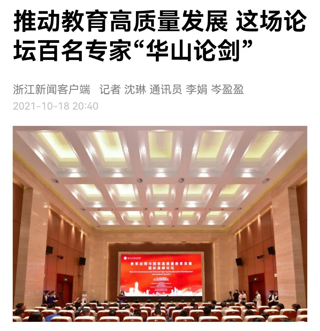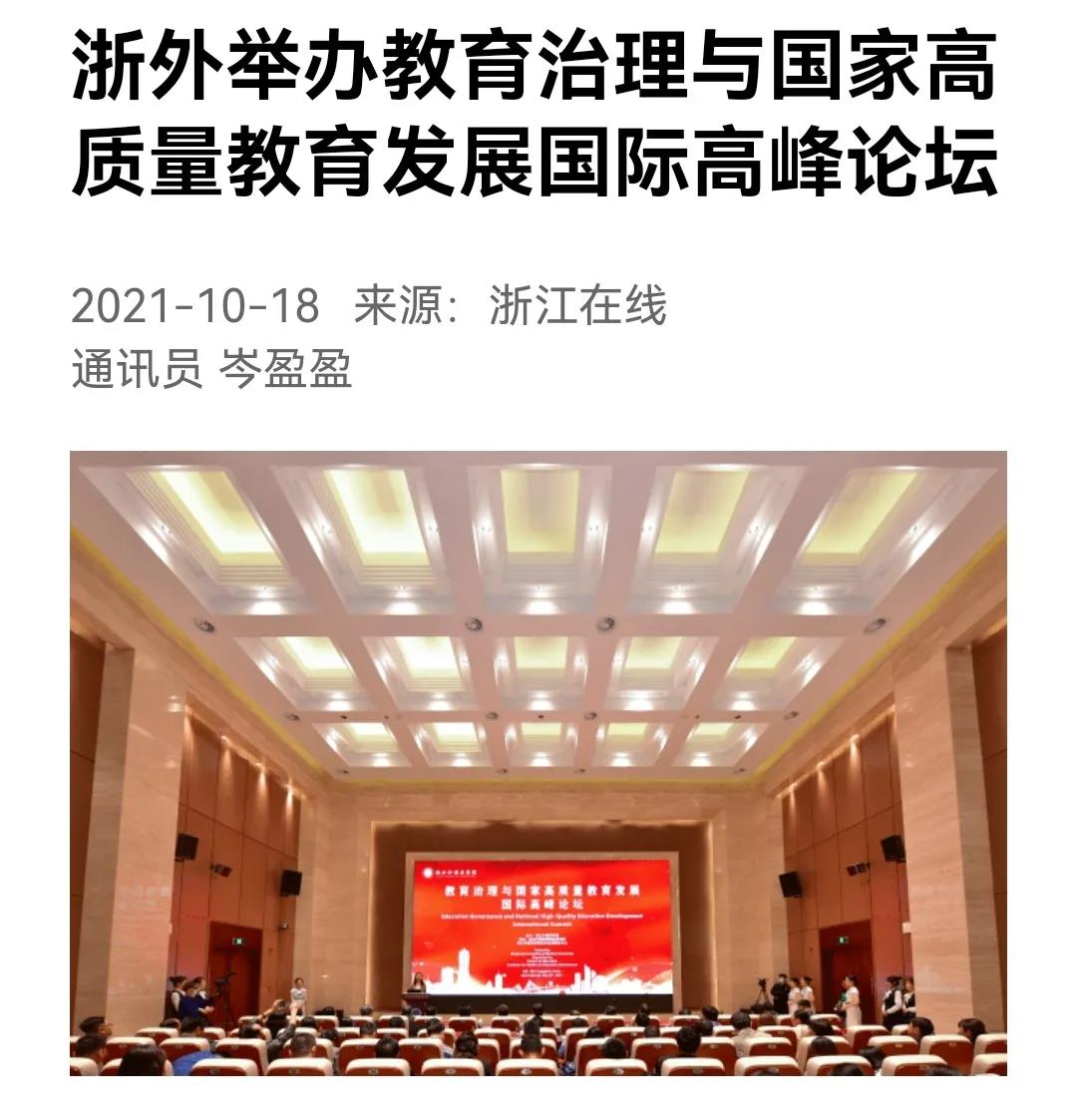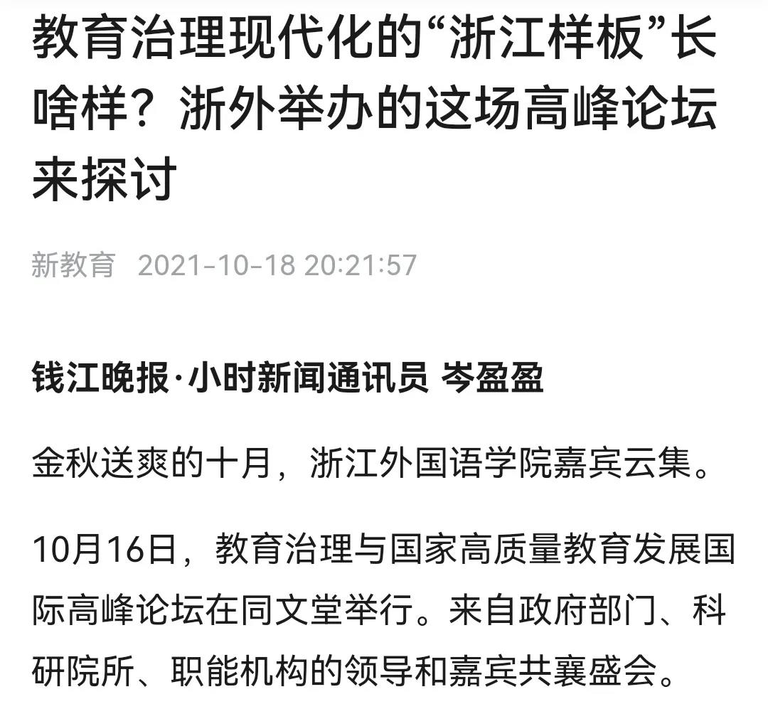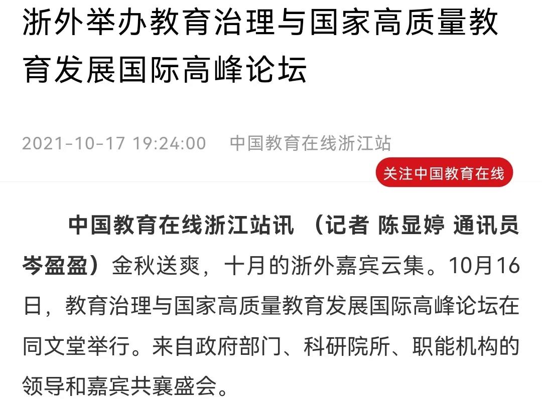 10月16日,浙外举办教育治理与国家高质量教育发展国际高峰论坛。来自北京大学、清华大学、香港大学、美国加州大学等50余所国内外大学和科研机构的110位专家学者围绕会议主题展开深入研讨。光明网、中国新闻网、浙江新闻客户端等多家媒体分别以《浙江外国语学院举办教育治理与国家高质量教育发展国际高峰论坛》《推动教育高质量发展这场论坛百名专家“华山论剑”》《教育治理现代化的“浙江样板”长啥样?浙外举办的这场高峰论坛来探讨》等为题进行了关注报道。