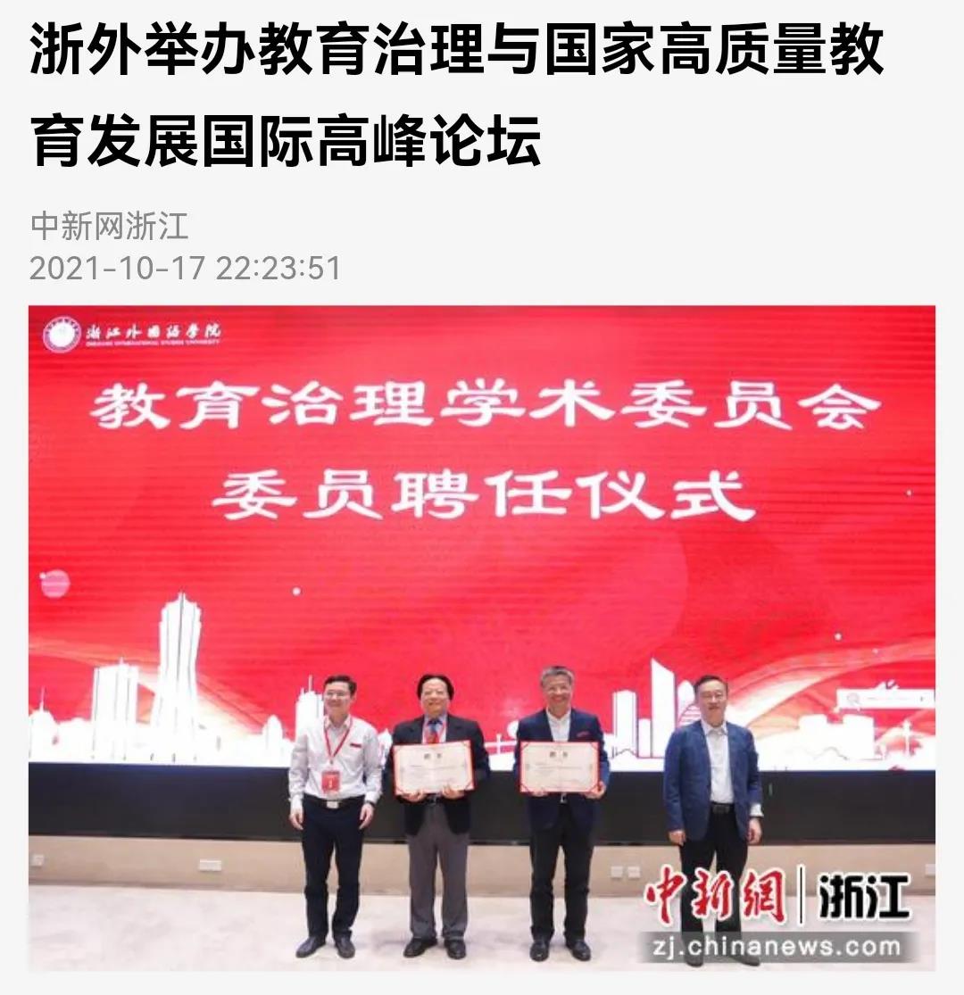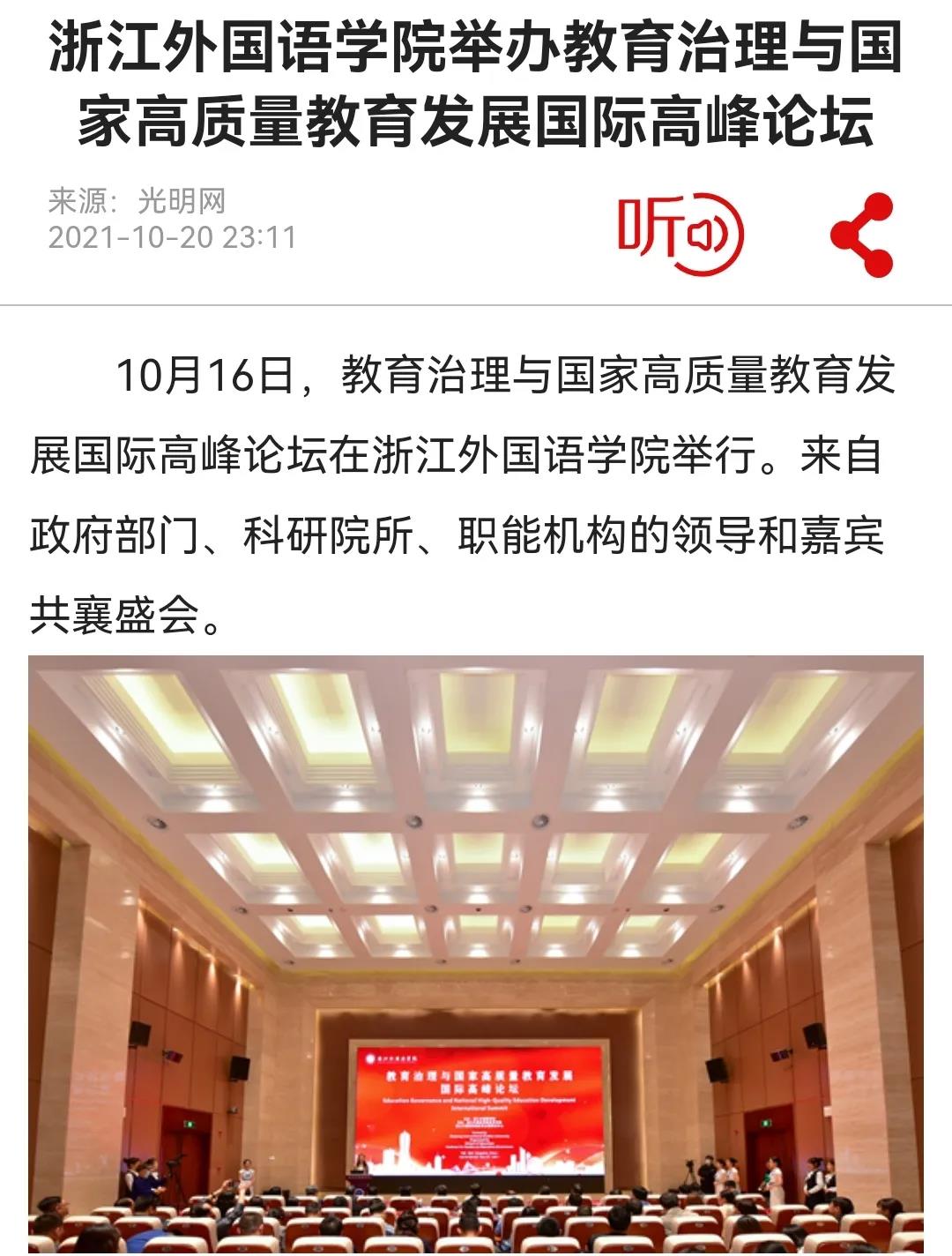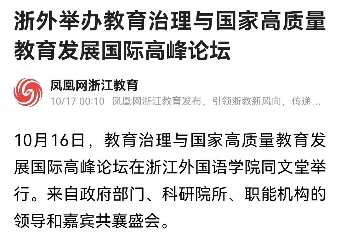 10月16日,浙外举办教育治理与国家高质量教育发展国际高峰论坛。来自北京大学、清华大学、香港大学、美国加州大学等50余所国内外大学和科研机构的110位专家学者围绕会议主题展开深入研讨。光明网、中国新闻网、浙江新闻客户端等多家媒体分别以《浙江外国语学院举办教育治理与国家高质量教育发展国际高峰论坛》《推动教育高质量发展这场论坛百名专家“华山论剑”》《教育治理现代化的“浙江样板”长啥样?浙外举办的这场高峰论坛来探讨》等为题进行了关注报道。