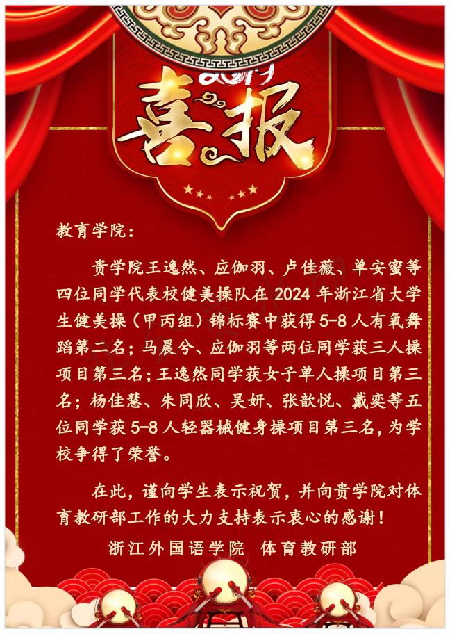 近日,教院学子坚持训练,相互鼓励,共同进步,在2024年浙江省大学生健美操锦标赛中取得佳绩!在此向她们致以最热烈的祝贺!