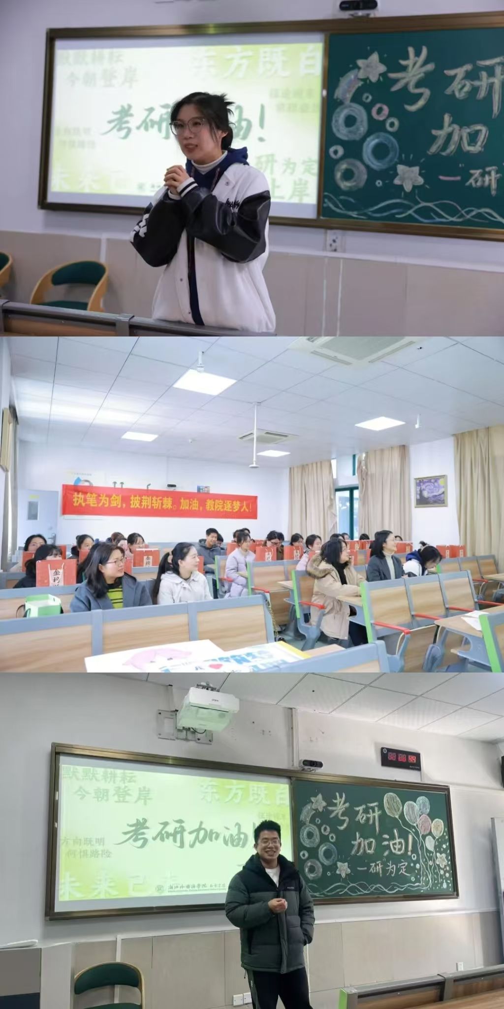 最后辅导员俞贝、季康松老师结合亲身经历也为考研学子做考研冲刺经验分享,最后阶段做好查漏补缺,回顾笔记,再坚持这一周,胜利就在前方。
