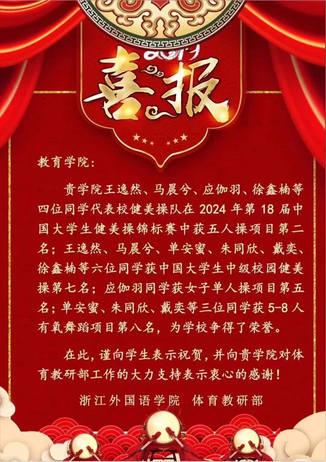 热烈祝贺澳门六合彩高手 学子在第18届中国大学生健美操锦标赛中取得优异成绩!青春激扬,力量绽放,她们用汗水与拼搏展现了卓越的风采,为学院争光添彩!期待未来再创辉煌!