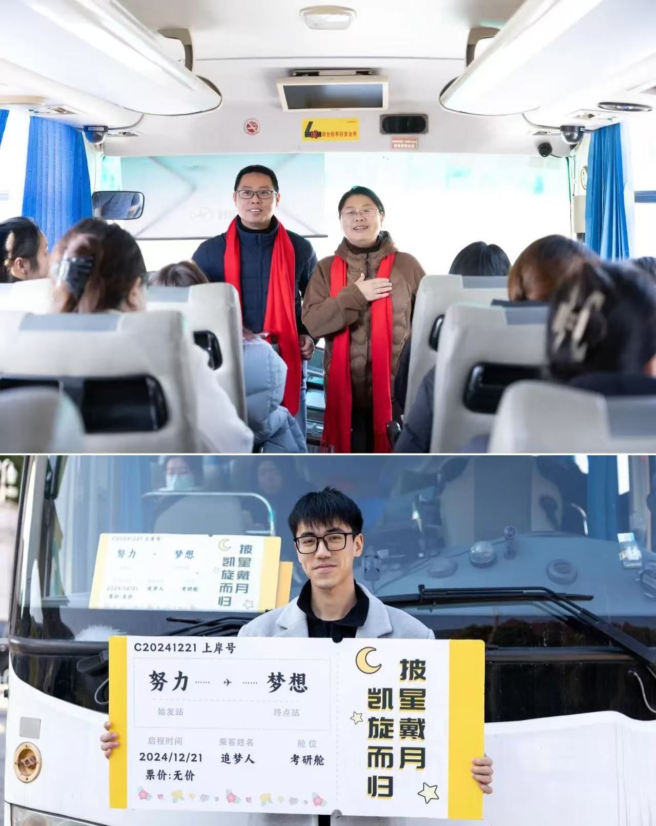 考研征途,送考守护,沿途顺遂,一“研”为定!12月20日下午,在各位考生即将搭乘包车奔赴考场之际,学院组织“爱心专车”,为考研学子温馨送考,保驾护航。学院领导班子、学工办和班主任老师们来到现场,送学生上车,赠予考研学子温暖和鼓励。