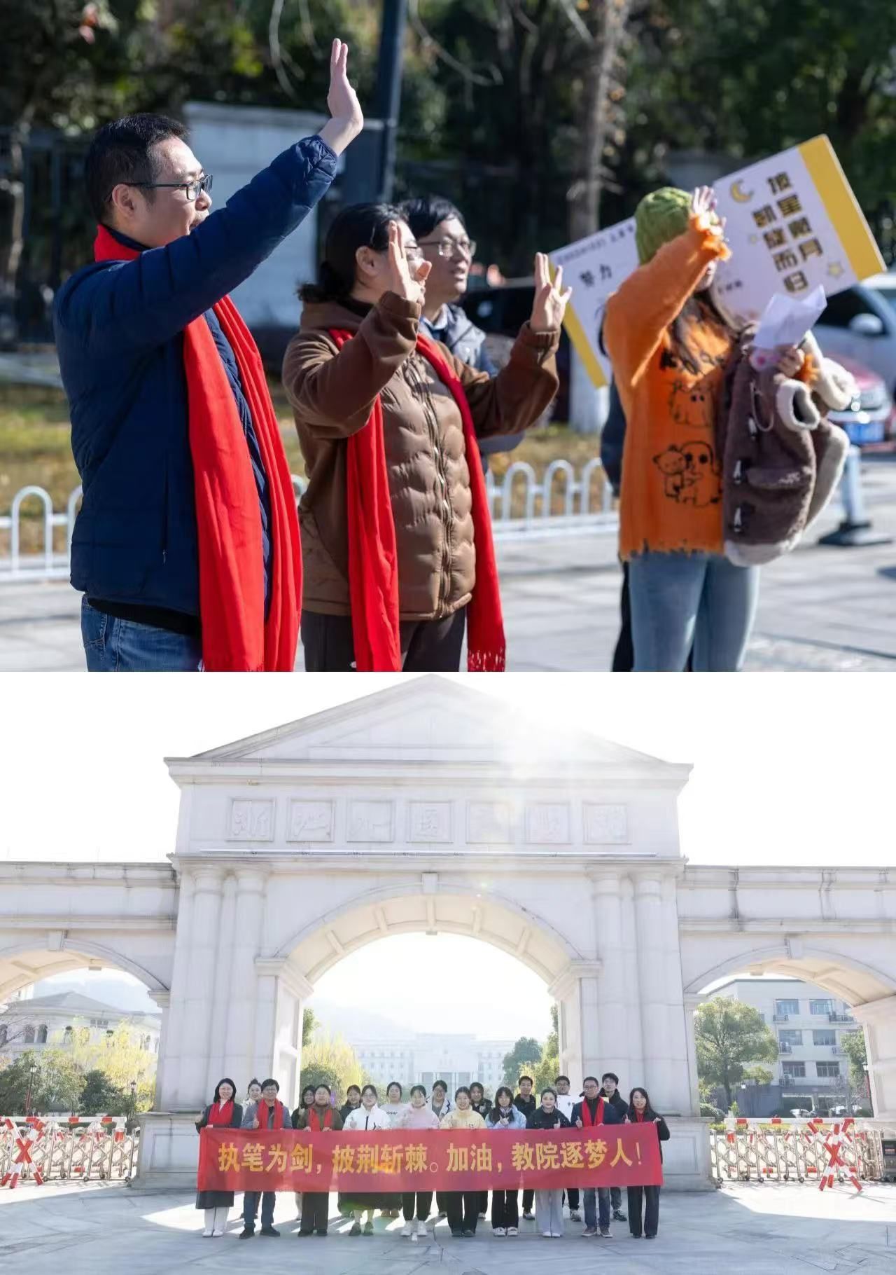 戴上红色围巾,寓意为学子送去无限鸿运,党委书记阮建苗、执行院长袁晖光等领导班子成员与考研学子亲切交流,提醒同学们注意安全,在考试过程中沉着泠静的应对每一场考试,以自信笃定的心态迎接每一个考验,希望他们在考试中胸有成竹,“妙”笔生花!