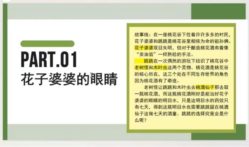 三月桃花谷酿酒季,眼盲的花子婆婆与跳跳协作酿酒。跳跳经老树怪、木叶虫指引,带桃花枝找到桃酒仙子,以做一周酒童换“明目水”,让婆婆重见光明七日。后跳跳放弃长期做酒童,接受短暂光明的礼物。故事藏着跳跳对婆婆的守护暖意,也传递出珍惜当下的的主旨,告诉我们要学会拥有舍弃的勇气。善意无需过度索取,陪伴亦是“看见”世界的方式。