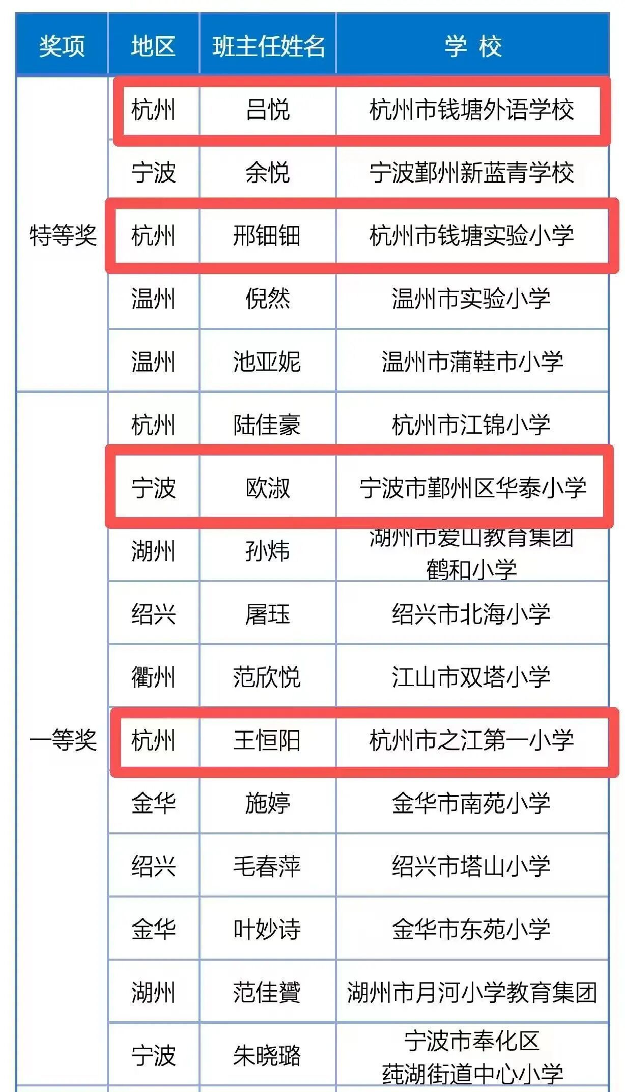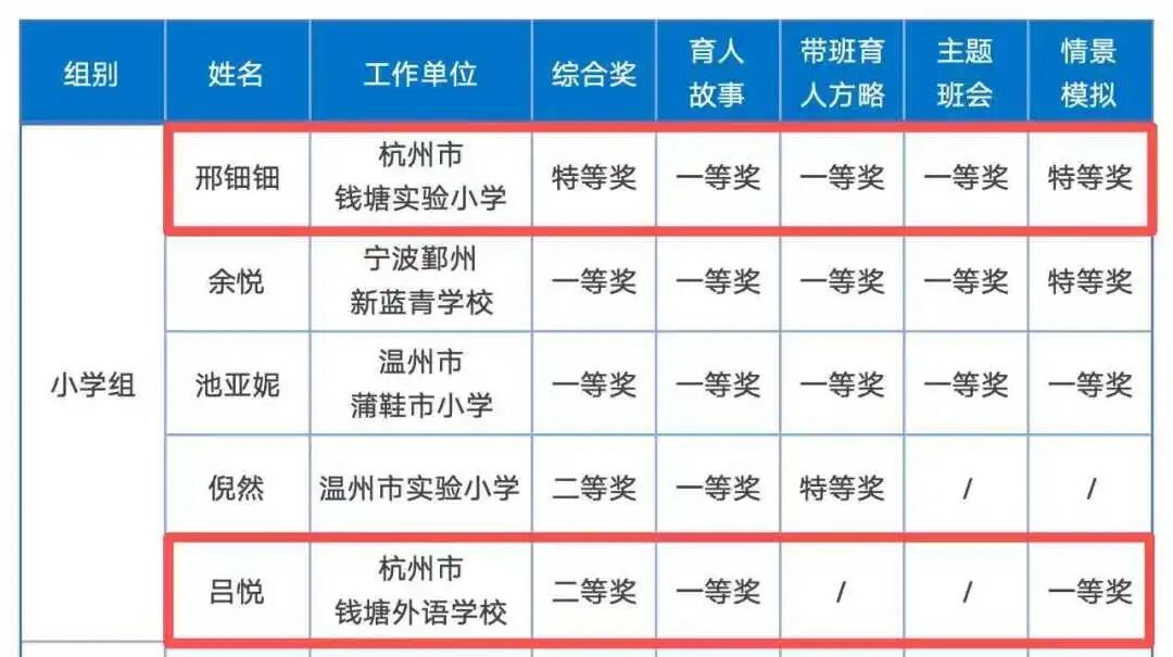 校友在中小学班主任基本功大赛中佳绩频传。第十四届长三角地区中小学班主任基本功大赛中,20届小学教育专业邢钿钿、19届小学教育专业吕悦分别荣获综合特等奖和综合二等奖。在2025浙江省中小学班主任基本功大赛中,邢钿钿、吕悦获特等奖,18届小学教育专业王恒阳、欧淑获一等奖,祝贺她们!