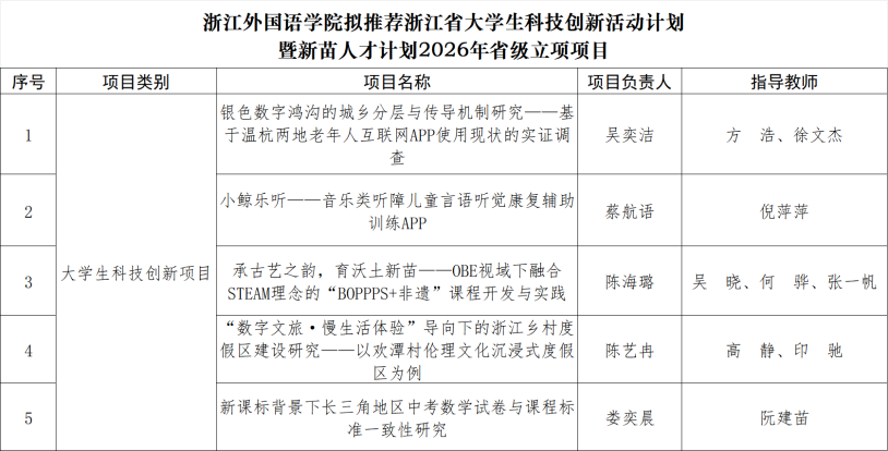 近日,浙江外国语学院2026年拟推荐浙江省大学生科技创新活动计划暨新苗人才计划项目名单正式公布。澳门六合彩高手